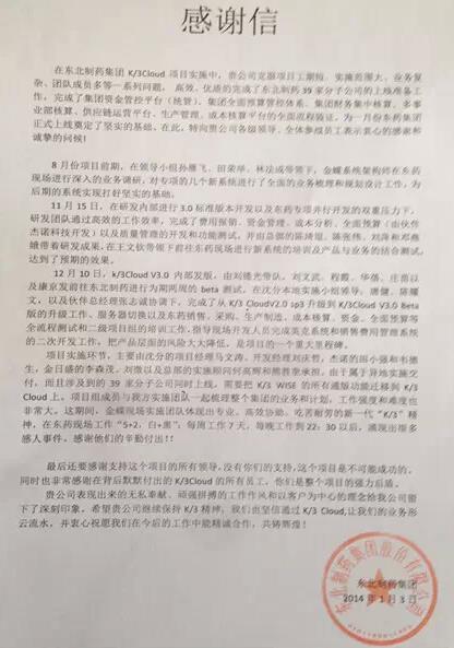 虽然K/3 Cloud 是K/3Wise的升级换代产品,但东药的选择仍然一如既往的谨慎,经过多次的方案交流、到金蝶总部交流学习、仿真测试、同类型软件对比等系列过程后,最终年轻的K/3 Cloud经受住了苛刻的检验,8个月后,东药30多家分子公司的全面深入应用上线,东药也再一次有了丰厚的收获。